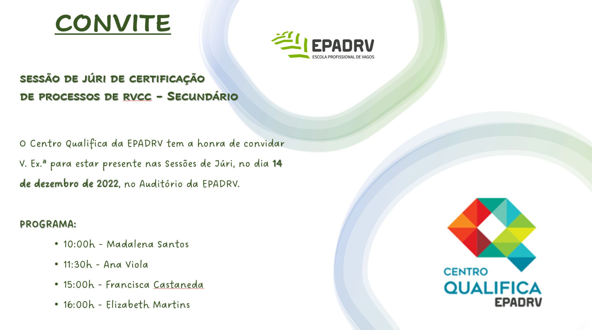 Vão realizar-se no Auditório da EPADRV, nos dias 13 e 14 de dezembro Sessões de Júri de Certificação Escolar.